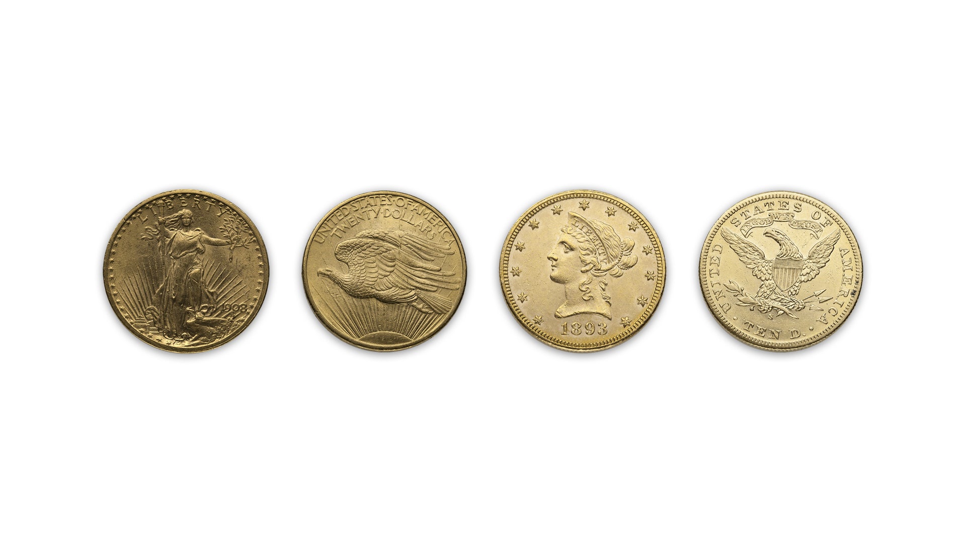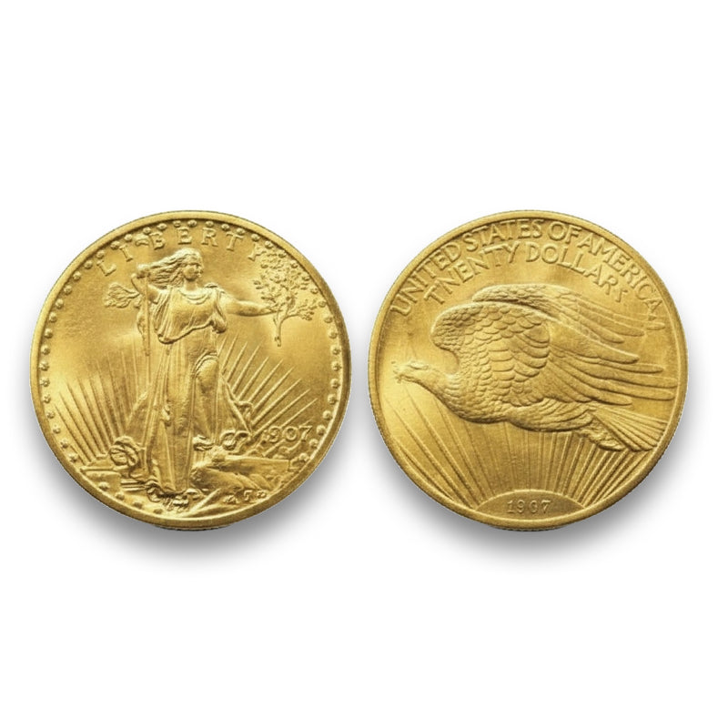 The $20 Gold coins issued from 1907-1933 are commonly referred to by the name of their design, the famous sculptor Augustus Saint-Gaudens. They feature a stunning portrayal of Ms. Liberty in a flowing gown on the obverse and a soaring eagle on the reverse.